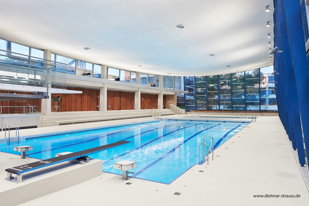 - Das unter Denkmalschutz stehende Hallenbad blieb in Form und Gestaltung unverändert.